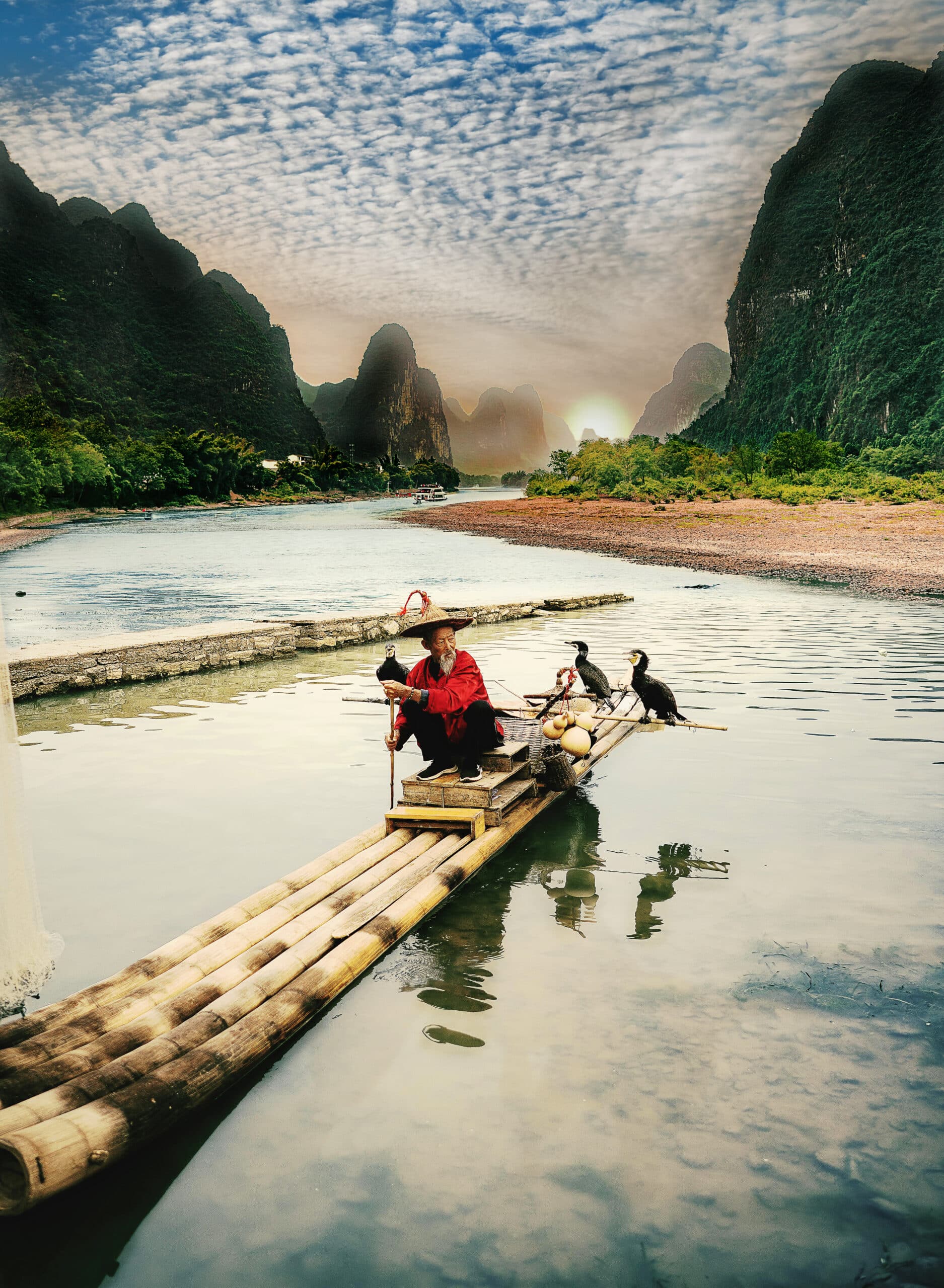 http://Pêcheur%20chinois%20sur%20radeau%20de%20bambou%20avec%20cormorans%20devant%20montagnes%20karstiques%20au%20coucher%20du%20soleil